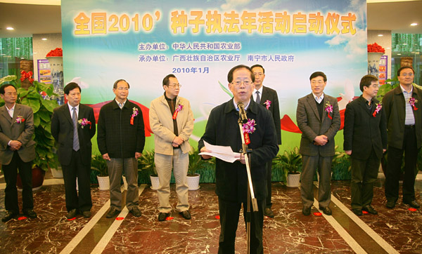 1月23日,“2010种子执法年”活动在广西南宁正式启动。农业部副部长危朝安在启动仪式上指出,农业部确定今年为种子执法年,绝不是一项阶段性的活动,而是种子管理思路的深化,管理内容的拓展,管理方式的创新。各地要高度重视,精心组织,明确责任和任务,确保执法年活动各项措施落实到位。
