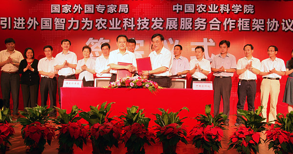 为进一步通过国家外国专家局的国外渠道,引进国外先进科学技术和优秀人才,促进中国农业科学院重大科技成果的转化、示范与推广,全面提升我国农业科技自主创新能力和国际竞争力,7月16日,中国农业科学院院长翟虎渠和国家外国专家局局长季允石代表双方签署了《引进外国智力为农业科技发展服务合作框架协议书》。双方将在引智平台建设、引智成果转化、科技成果产业化、科技人才培养等方面建立更加紧密的合作关系,促进科研与引智相结合,实现科技创新、成果转化、人才培养、资源优化等方面的共同发展。