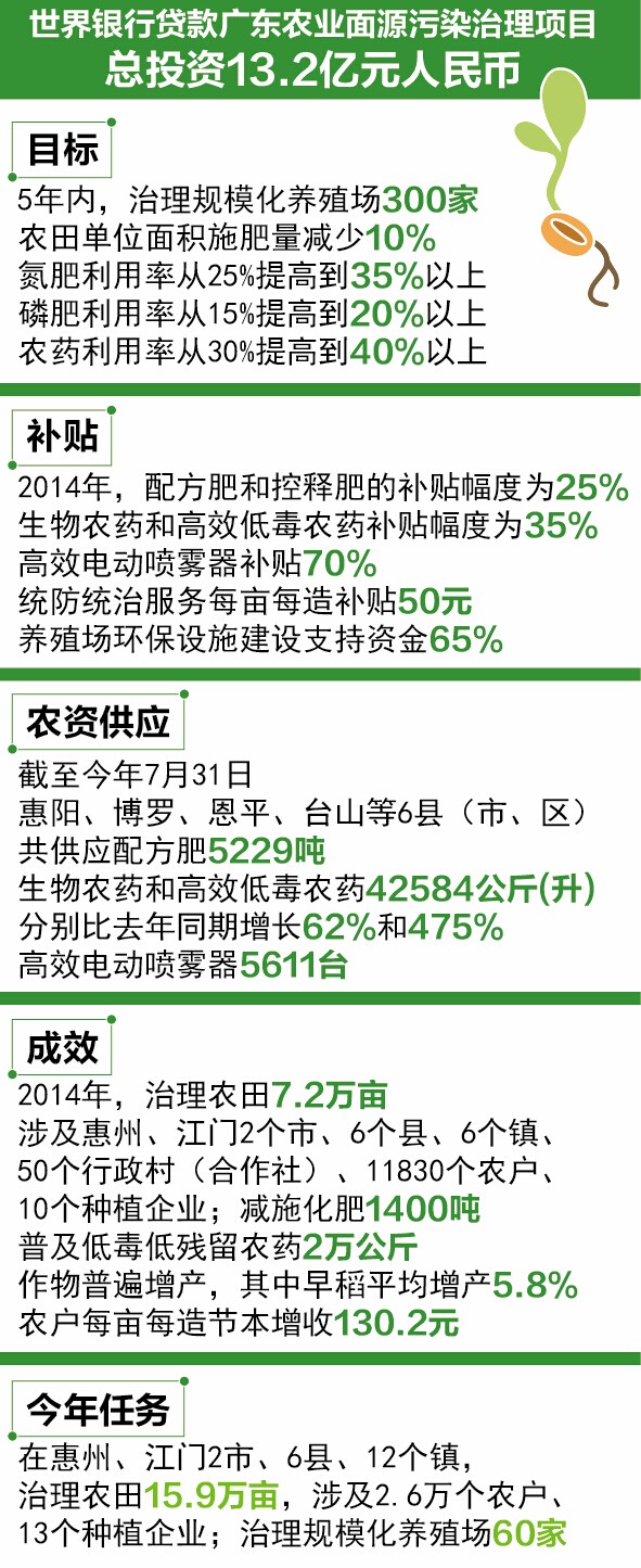 2014年3月,广东省启动了“世界银行贷款广东农业面源污染治理项目”,这是国内首个利用世界银行贷款实施农业面源污染治理的项目,总投资达13.2亿元人民币,计划在5年内,在广东全省范围内推进环境友好型种植,并治理规模化养殖场300家,以求转变传统高污染的粗放型农业生产方式,使项目区农田单位面积施肥量减少10%,氮肥利用率从25%提高到35%以上,磷肥利用率从15%提高到20%以上,项目区农药利用率从30%提高到40%以上等等。