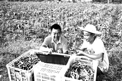① 湖北省宜昌市夷陵区新媒体工作人员(左)在鸦鹊岭镇新场村生态农业园蔬菜基地现场发布黄秋葵销售信息。