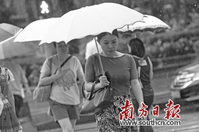 15日傍晚,深圳罗湖,一场暴雨缓解了闷热,行人匆匆前行。南方日报记者 朱洪波 摄