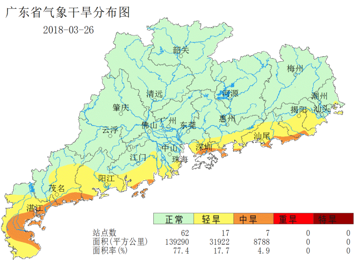 上周(3月19~25日),全省平均气温18.4℃,与常年同期持平,其中西北、东北大部、中部局部地区14.9~18.0℃,其余大部分地区18.0~20.8℃(图1);平均日照时数44.1小时,较常年同期显著偏多近2.4倍,其中西北、中部、西南局部偏多3.0~5.4倍,其余大部分地区偏多1~3倍(图2),全省共11个站破历史同期最高值;平均降水量20.5毫米,较常年同期偏少近4成,西南、中部局部地区正常到偏多5成(封开偏多1.4倍),其余大部分地区正常到偏少1倍,陆丰站无降水。目前全省大部分地区早稻处于出苗-三叶期,梅县已经进入移栽期,其余仍有部分地区处于播种-出苗期,据农业厅调查,目前早稻播种进度与往年持平;荔枝、龙眼为花芽分化期;沙田柚为开花期。上周广东省日照显著偏多、降水偏少,气温正常,温高光足的天气条件有利于大部分地区早稻、花生、玉米等作物的生长,对喷肥施药、犁耙田等农事活动的开展也较为有利。南部沿海尤其是雷州半岛地区降水持续偏少,对秧苗生长以及春耕生产用水有一定不利影响。根据气象干旱监测,目前南部沿海地区共17个站出现轻旱,7个站出现中旱(图3)。