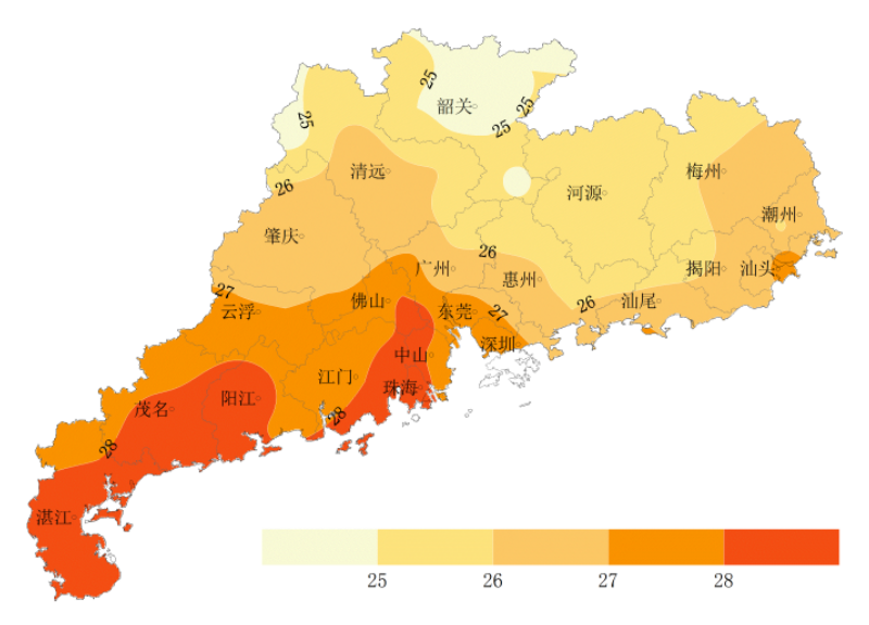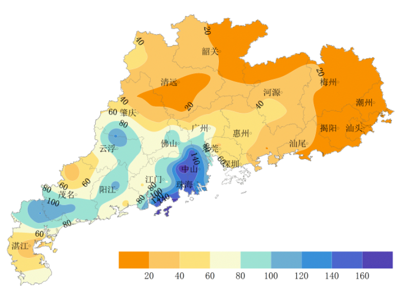 上周(6月11~17日),全省平均气温26.7℃,较常年同期偏低0.7℃,西南、中部局部地区27.0~28.5℃,其余大部分地区24.4~27.0℃(图1),与常年同期相比,全省大部分地区正常到偏低1.7℃;全省平均累计降水量51.0毫米,较常年同期偏少6成多且分布不均,其中西南局部、中部局部100.0~154.0毫米(其中上川岛207.3毫米、新会176.4毫米),西北、东部大部、中部局部地区1.1~40毫米,其余大部分地区40~100毫米(图2),全省共7个站点降水量破历史同期最高,11个站点降水量破历史同期最低,与常年同期相比,除雷州半岛、中部局部地区偏多3成到1.6倍(徐闻77.4毫米,较常年同期3.1毫米偏多近24倍、遂溪偏多近5倍)外,其余大部分地区正常到偏少1倍;全省平均累计日照时数27.8小时,较常年同期偏多1成,西南局部、中部局部、东南局部地区30.0~48.0小时,其余大部11.0~30.0小时。