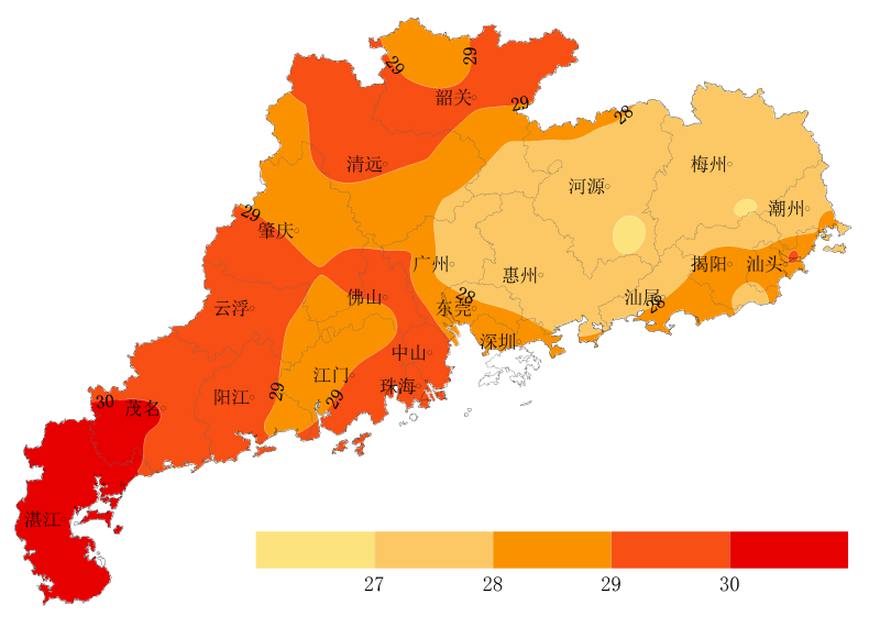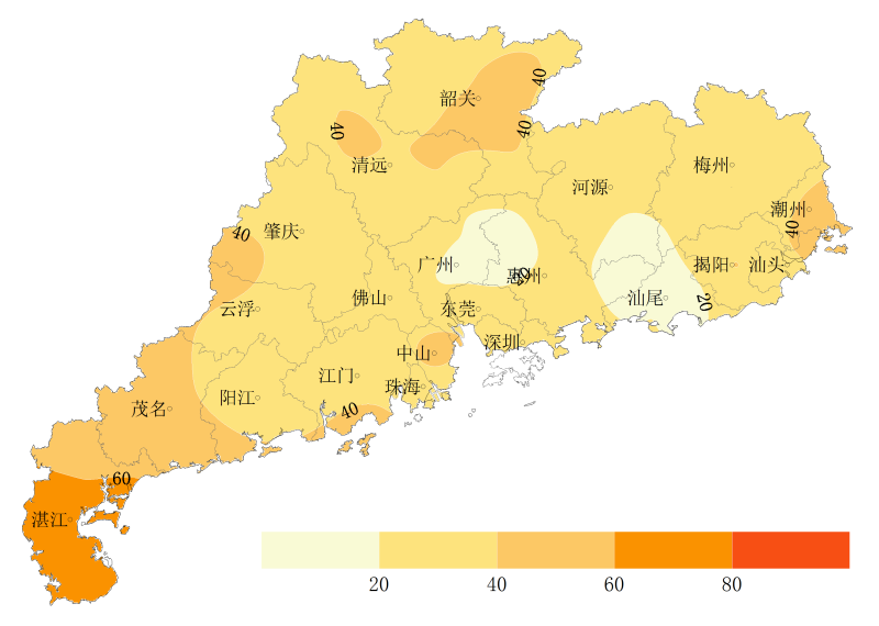 预计,10日,珠江三角洲的南部沿海和粤西地区多云为主,有中(雷)阵雨局部暴雨,其余地区晴到多云,局部(雷)阵雨。11日,受台风外围环流影响,粤东、粤北地区晴到多云转中到强雷雨局部暴雨,其余地区晴到多云,局部(雷)阵雨。12日,粤北和粤东地区有中雷雨局部大雨到暴雨,珠三角地区有雷阵雨局部大雨,其余地区多云间阴天,有分散雷阵雨。13~14日,南海北部可能有热带扰动发展,全省南部沿海地区多云到阴天有中到大雨局部暴雨,中部地区有中雷阵雨局部大雨,其余地区多云到阴天有(雷)阵雨。