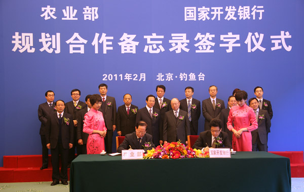 农业部副部长危朝安和国家开发银行副行长高坚分别代表双方签字,农业部总经济师陈萌山、杨绍品以及双方相关司局负责同志参加了签字仪式。
