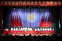 会议还表演了由省农业厅100多名干部职工编排的大型文艺节目《旗帜更鲜艳》。整台节目以党的发展壮大历史为主线,大力讴歌中国共产党为民族的解放、国家的富强、人民的幸福而不懈奋斗的丰功伟绩,展现了新时期南粤农业人求真务实、改革创新、敢为人先的精神。节目以聆听岁月的脚步、激荡儿女的心灵、跟随母亲的道路、旗帜开创的辉煌四个篇章,诠释了省农业厅广大党员干部职工忠于党、忠于人民,深入贯彻落实科学发展观,执着追求“三农”事业,努力建设幸福广东、建设现代农业强省的坚定信念和决心。