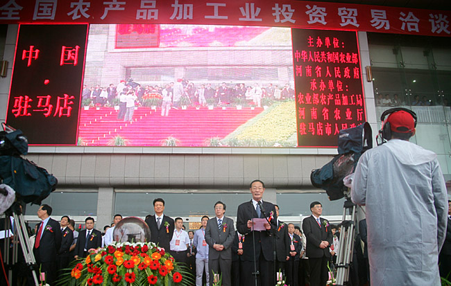 9月6日,全国政协副主席陈宗兴在河南驻马店宣布,2011年全国农产品加工业投资贸易洽谈会开幕,并与河南省省长郭庚茂、农业部副部长高鸿宾、国家粮食局副局长吴子丹共同按下启动球。