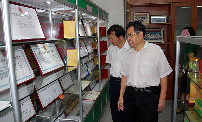 钟邵彬秘书长(右)带瞿志印副院长(左)参观协会荣誉展示,和优质农产品展厅