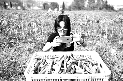 ② 新媒体工作人员在现场拍摄黄秋葵照片为发布销售信息作准备。