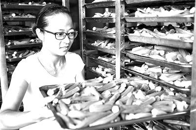 ③ 鸦鹊岭镇新场村生态农业园蔬菜基地工人对清洗后的黄秋葵进行上架晾干。