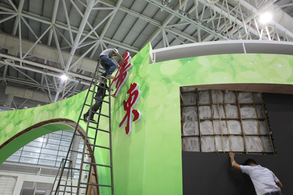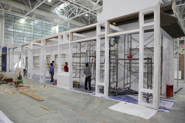 布展工作人员正热火朝天地施工,展区框架已基本搭建完毕,现场堆积着各种材料,最后的装饰工作正紧张有序地进行。