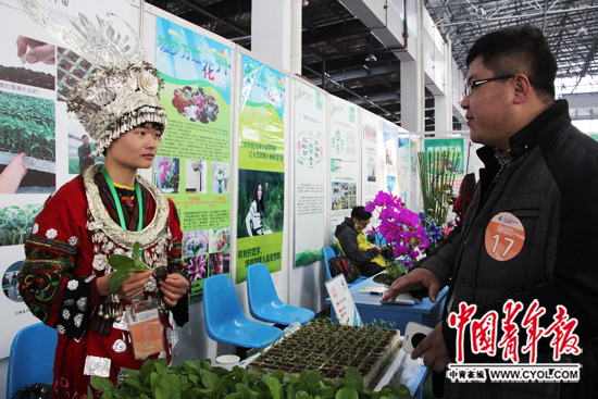 11月30日,在“邮储银行杯”2015中国青年涉农产业创业创富大赛全国赛初赛的比赛间隙,一位汉族选手与少数民族女选手正在交流参赛项目情况。