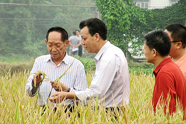 19日,袁隆平(左二)在龙田镇环陂村的稻田里察看水稻情况。