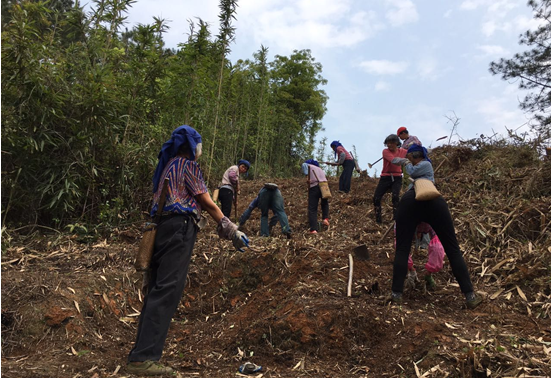 广宁湘下村村民投工投劳,积极参与山地整合,种植油茶。