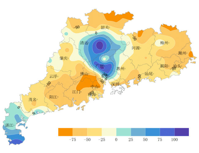 上周(4月9-15日),全省平均气温22.4℃,较常年同期偏高1.2℃,各地气温由北至南递增,其中北部19.6~22.0℃,雷州半岛24.0~25.2℃,其余地区22.0~24.0℃(图1);全省平均累计降水量29.2毫米,较常年同期偏少3成,各地降水不均,其中东莞-广州-清远一带40~138.3毫米,较常年同期偏多5成~1.2倍,其余大部分地区降水少于40毫米,且较常年同期偏少3~8成(图2);全省平均累计日照时数23.8小时,较常年同期偏多近4成,其中东南沿海和雷州半岛30~56.3小时,其余大部分地区10~30小时。