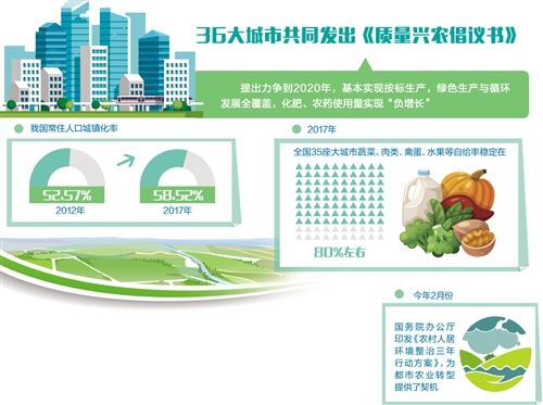 5月3日,在天津举办的全国都市现代农业现场交流会上,36大城市共同发出《质量兴农倡议书》,提出力争到2020年基本实现按标生产,绿色生产与循环发展全覆盖,化肥、农药使用量实现“负增长”,群众对农产品质量安全总体满意度大幅提升。
